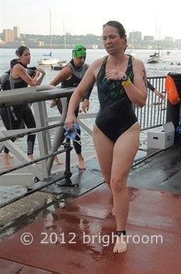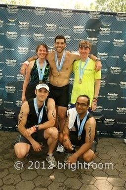 The Beeminder founders completed the NYC Triathlon yesterday. [1] I was nearly twice as fast as Danny in the swim — 1.5 km down the Hudson — but he took those 15 minutes back out of me on the 40 km bike course. Danny was hilariously lopsided. There were only a few people in his division slower than him in the swim (he doesn’t swim so much as tread water in a vaguely forward direction) and only a handful faster in the bike. (Full results for Team Beeminder: Jake, Mike, Danny, Bethany, Sharad.)